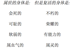 那么,哥林多前书15:50:“血肉之体(注意:此处是单数动词)不能承受神的国”怎么说呢?难道这不表示耶稣的身体并引申到我们复活的身体必定是非物质的吗?并非如此!几乎所有的评论家都清楚“血肉之体”这个表述是典型的犹太人谚语,表示我们软弱的人性。保罗在其他地方也用了这表述来代表“属血气的”(以弗所书6:12),甚至代表“属血气的人”(加拉太书1:16)。因此,经文的后半段和前半段平行“必朽坏的不能承受不朽坏的”。现今的身体必要脱离朽坏,而不是脱离物质性,这样才能符合神永恒国度的要求。
